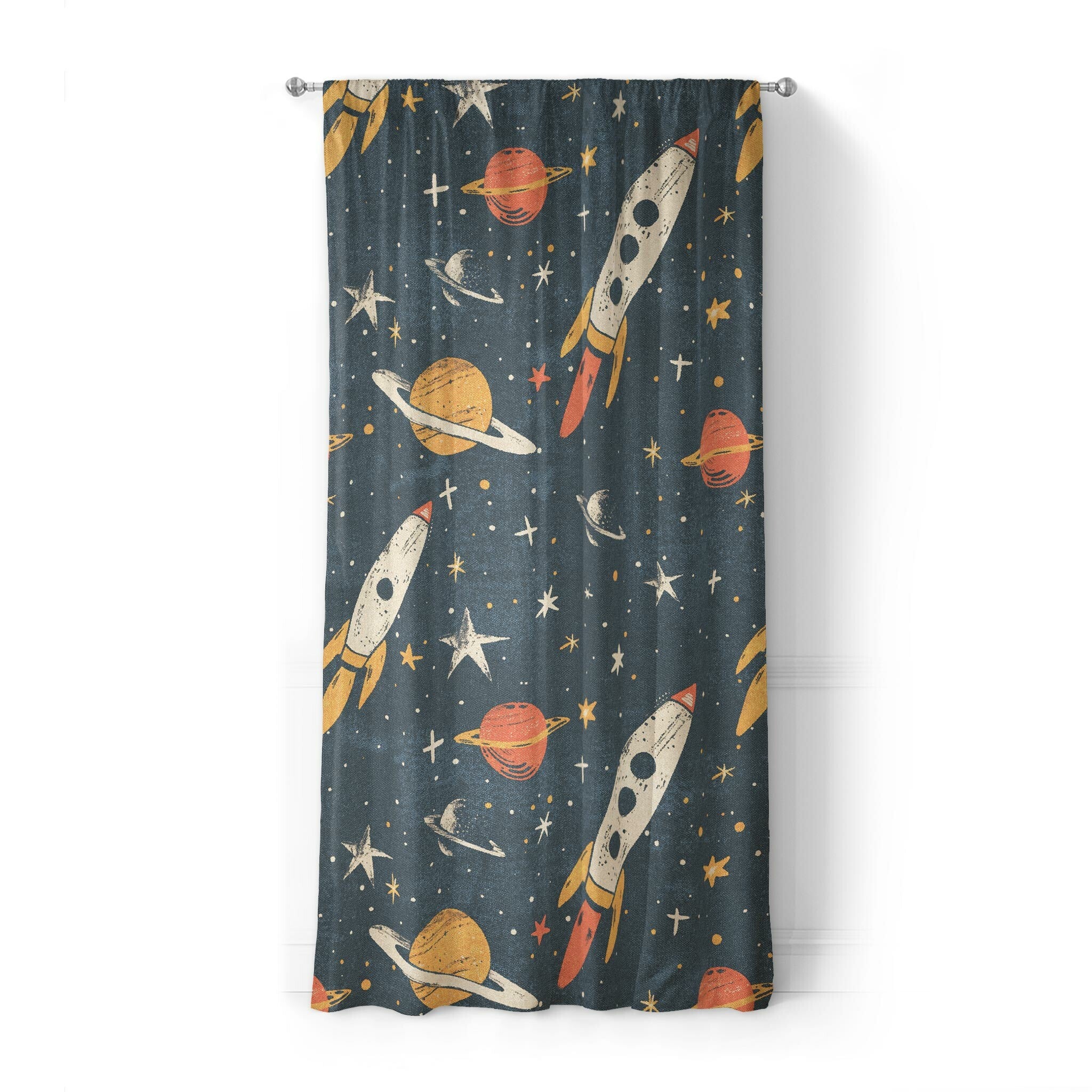 Each panel is hemmed and finished with a 4" rod pocket that fits most standard curtain rods. Just slide them on and let the artwork do the heavy lifting. Available in two lengths to fit your space and make your guests ask "where'd you get those curtains?".