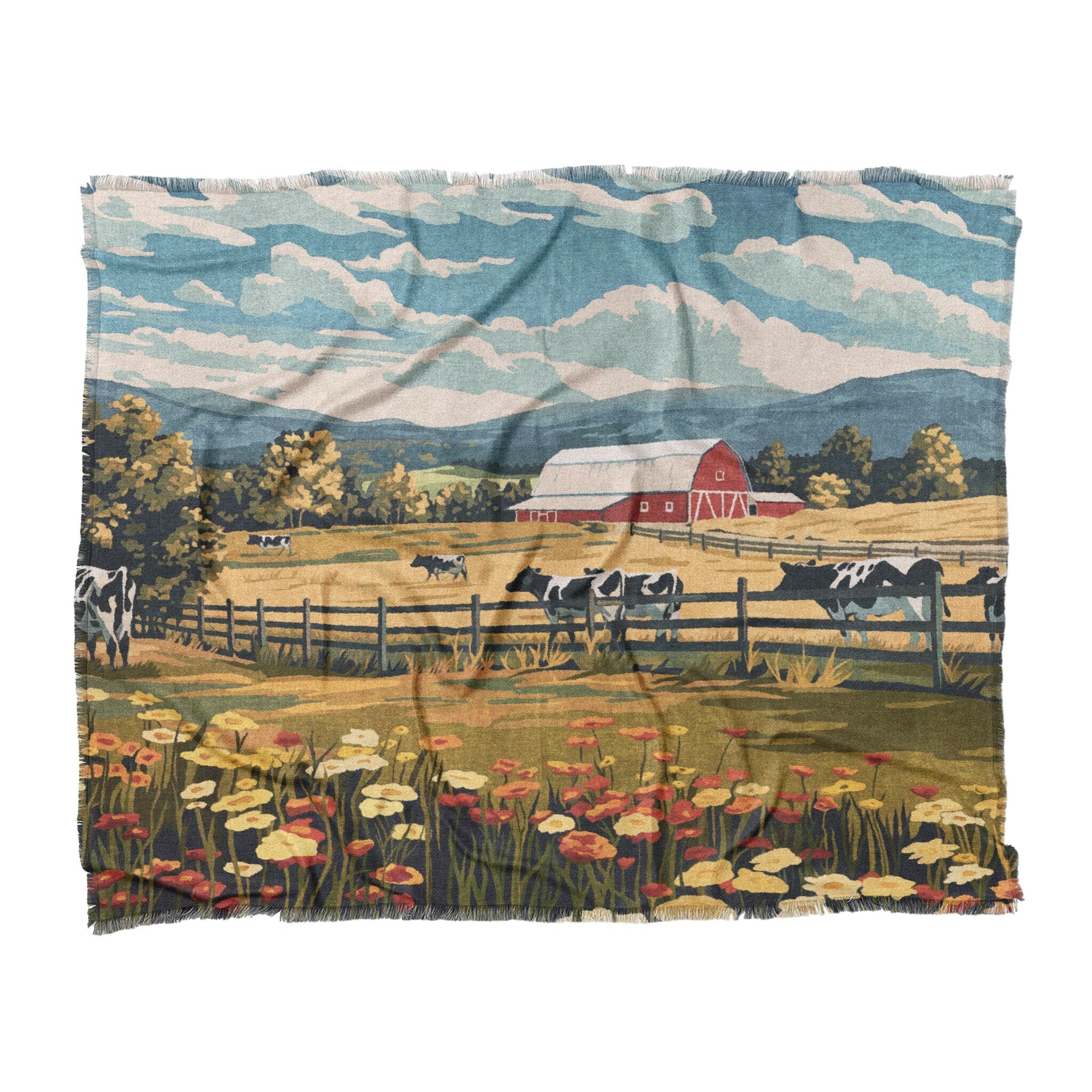 Bring a little pastoral charm into your space with Vermont Spring Farmlife, a scenic textile design featuring Holstein cows, a red barn, and rolling green pastures set against a backdrop of distant mountains and blue sky. Warm wildflowers in the foreground add a vibrant contrast, making this design a standout in rustic, farmhouse, or cottagecore aesthetics. It’s a peaceful, nostalgic piece that captures the quiet beauty of rural life, perfect for anyone who feels at home in the country or just dreams of it. Ideal for adding a touch of Americana to any room.