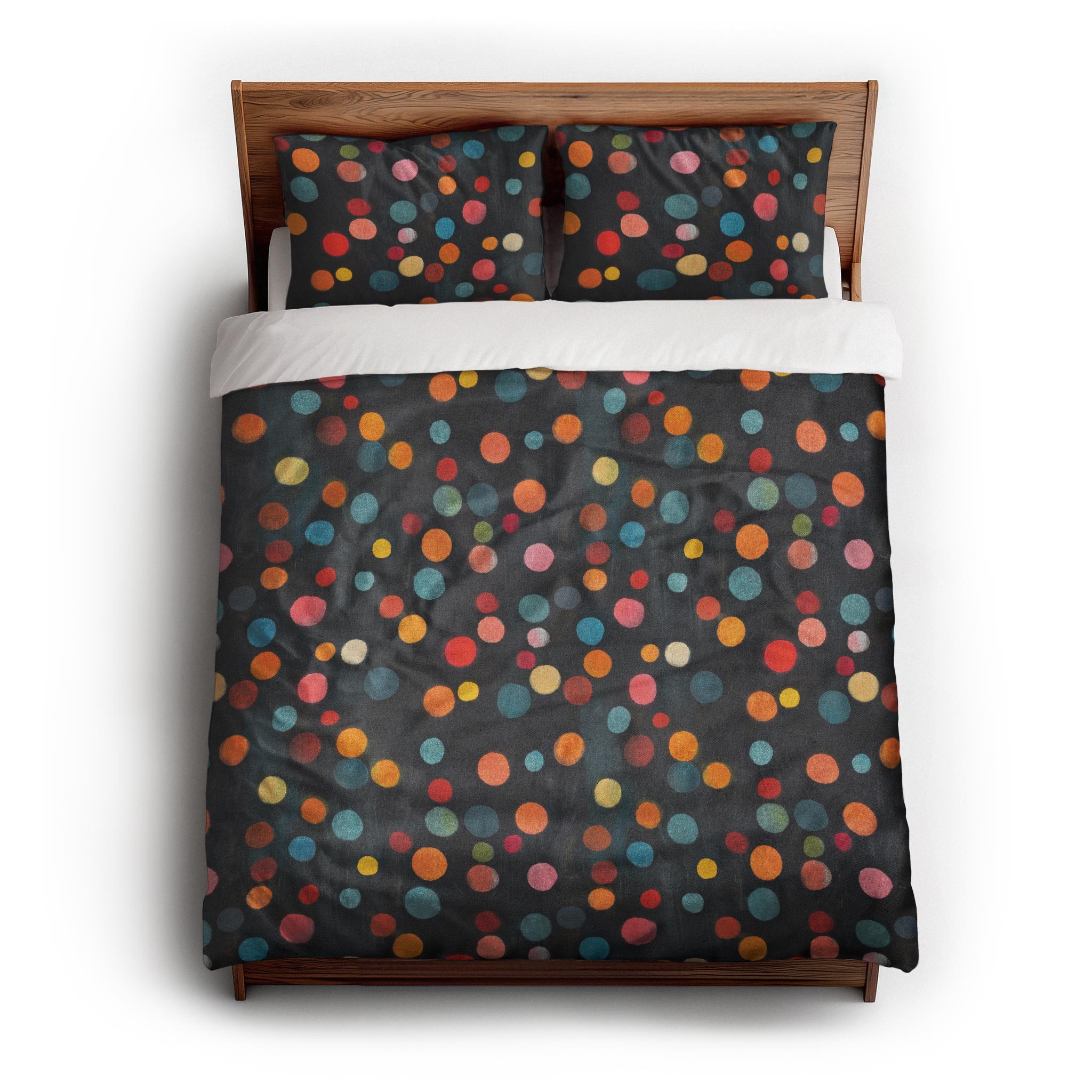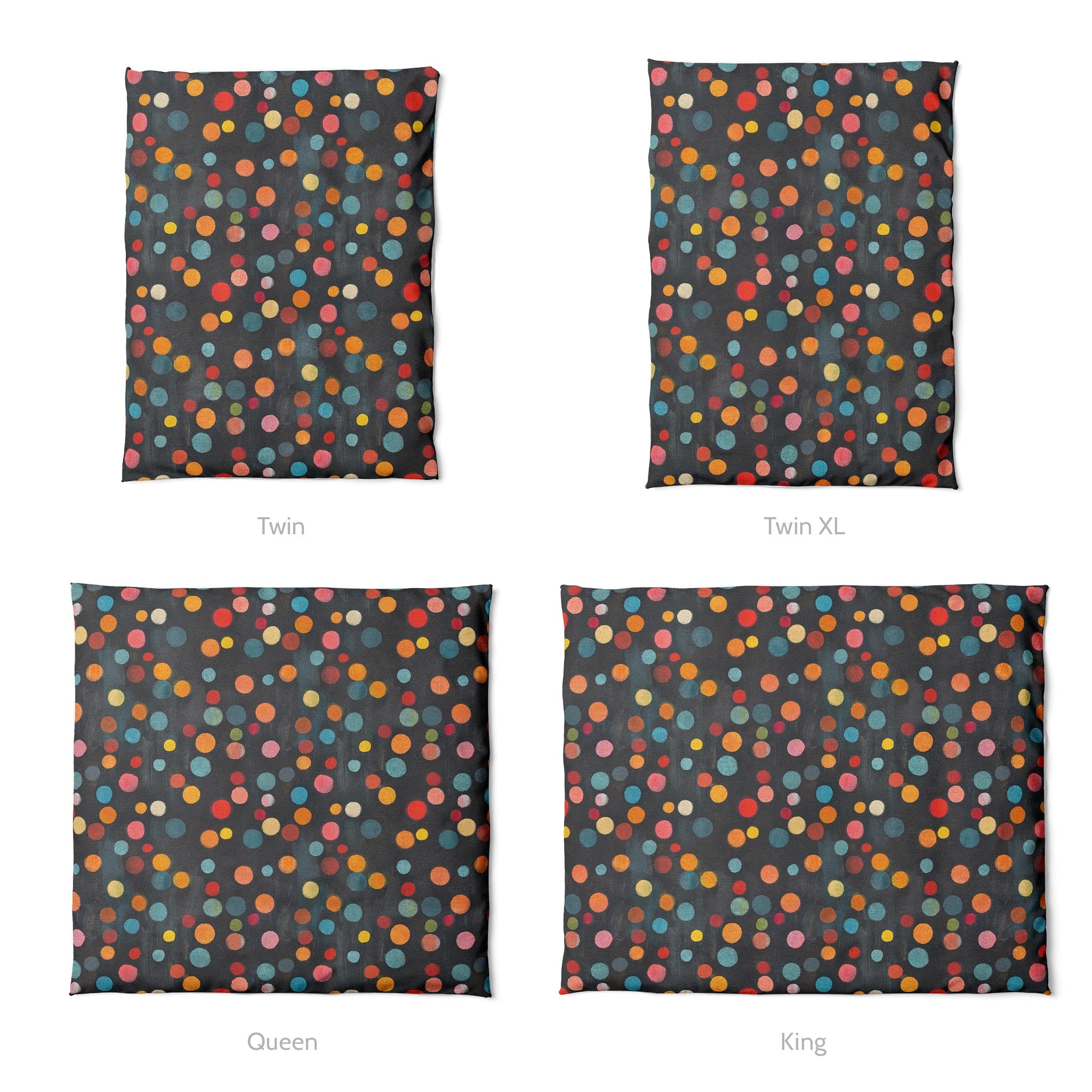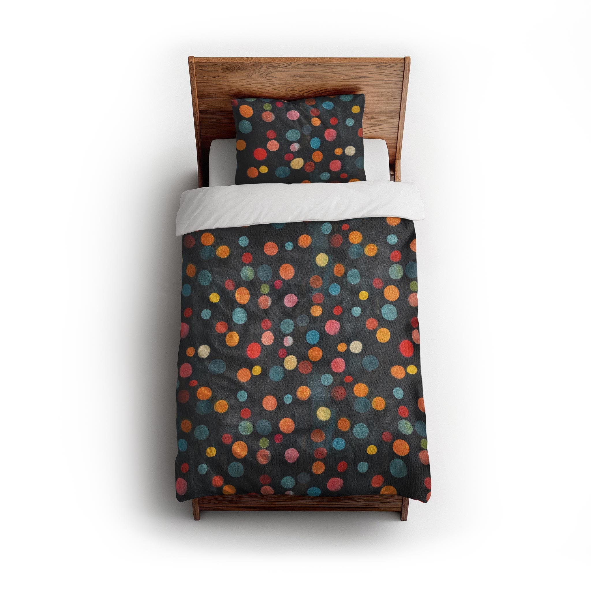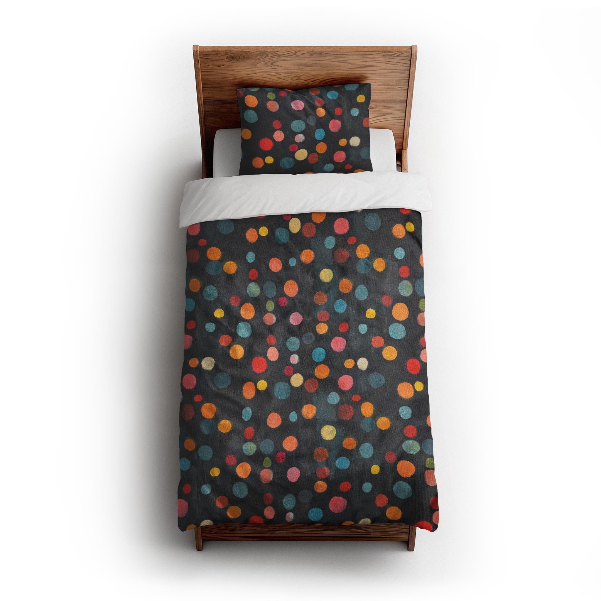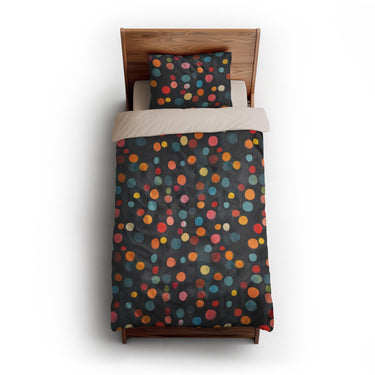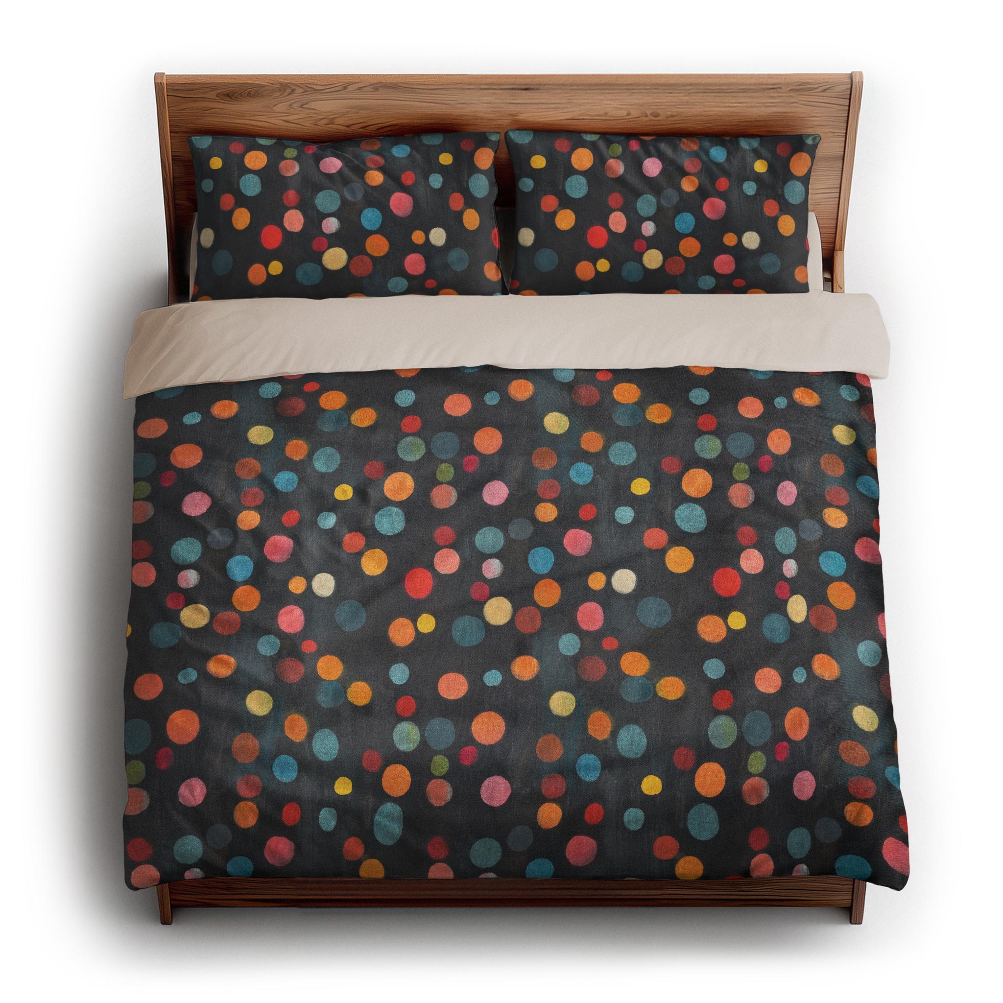 series captures the soft blur of out-of-focus city lights, with two distinct moods: Dawn glows in muted pastels over denim blue, while Night pops with saturated jewel tones on charcoal black. These playful, colorful dots add a touch of magic and movement to any space; from playful kids' rooms to bold, modern interiors. Whether you’re going for cozy and whimsical or chic and moody, this design brings light and energy to any setting.